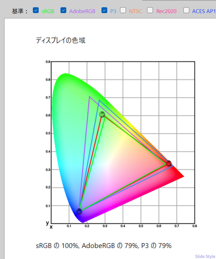 sRGB(エス・アール・ジービー)カバー率100%で、AdobeRGBも79%、P3も79%に達しています。