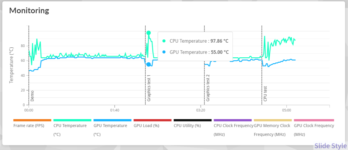 高負荷のテスト(CINEBENCH R23のマルチコアテストを連続実行)では、CPU温度が89〜97℃まで上がる場面がありました。