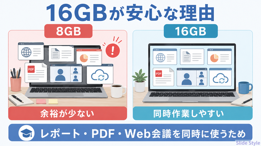 短期的には使える場面もありますが、4年間使うなら16GBをおすすめします。ブラウザ、Office、オンライン授業、クラウド同期を同時に使うと8GBでは余裕が少なくなります。