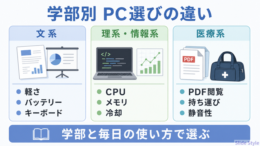 | どの学部・学科で使うか | 文系は軽さと電池持ち、理系・情報系はCPUとメモリ、医療系はPDF閲覧と持ち運びを重視 | 理系なのに最低構成を選び、専門ソフトや研究で性能不足になる |