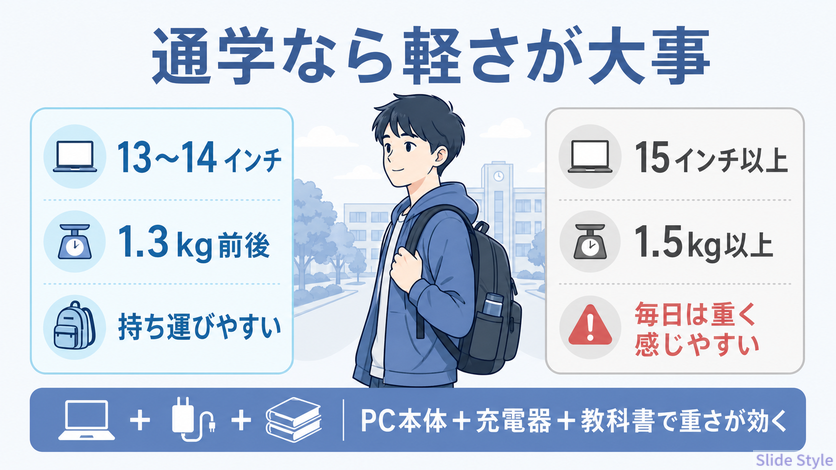 - 重さを軽視する:PC本体に加えて充電器、教科書、飲み物を持つため、1.5kg台は負担になりやすい