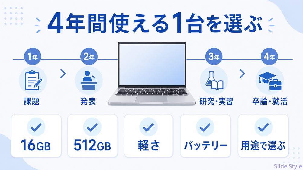大学生向けパソコンは「今レポートが書けるか」だけでなく、4年間で課題量や使い方が増えることまで見て選ぶのがおすすめです。