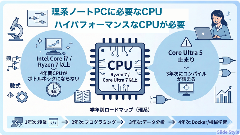 | CPU | Core Ultra 5 / Ryzen 5 | Core Ultra 7 / Ryzen 7 以上 | 3年次以降のシミュレーション・機械学習に対応するため |